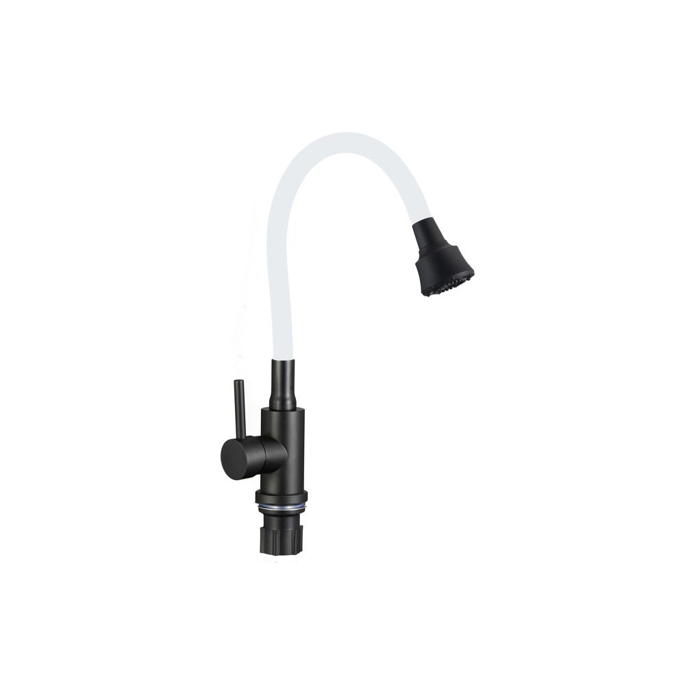 - Современный дизайн: Черный цвет и гладкие линии делают смеситель стильным элементом, который легко впишется в любой кухонный интерьер.