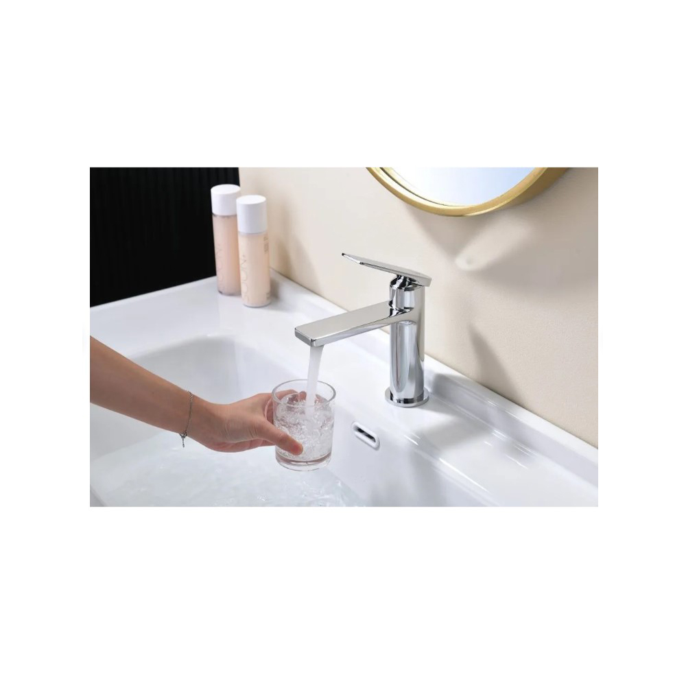 Изготовленный из качественных материалов, этот смеситель обеспечивает долговечность и надежность в эксплуатации. Хромированная поверхность придает ему стильный вид и защищает от коррозии, что гарантирует сохранность внешнего вида на долгое время. Есть возможность легко соединить его с любыми стандартными раковинами и умывальниками.